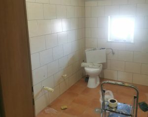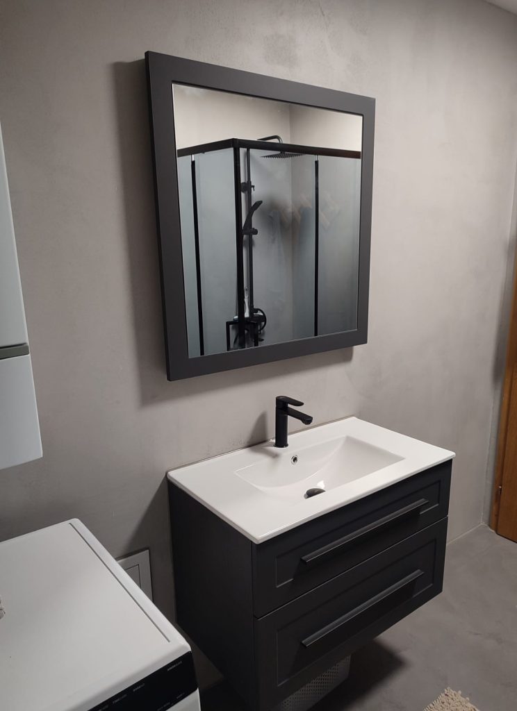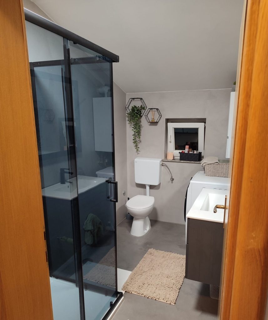 Naš nedavno završen projekt renovacije kupaonice predstavlja savršen spoj funkcionalnosti i estetike. Stare pločice su zamijenjene mikrocementom u dvije elegantne sive nijanse – tamnijom na podu i svjetlijom na zidovima, stvarajući besprijekoran kontrast.