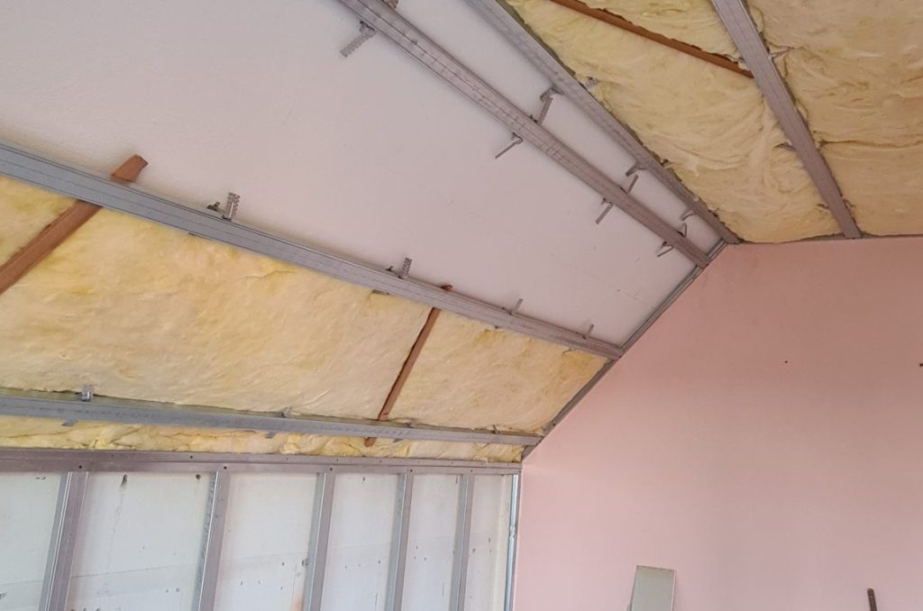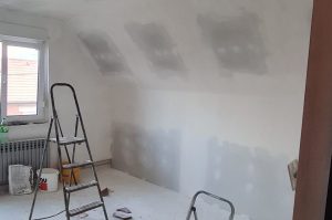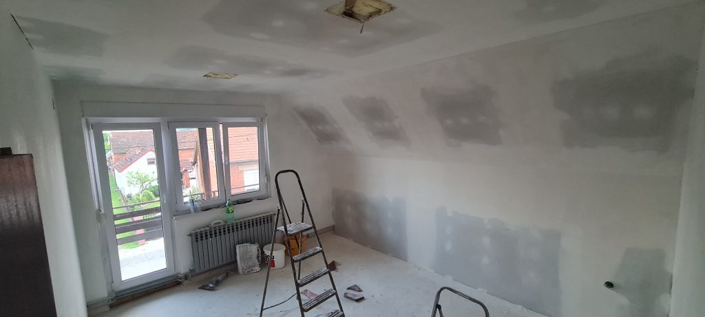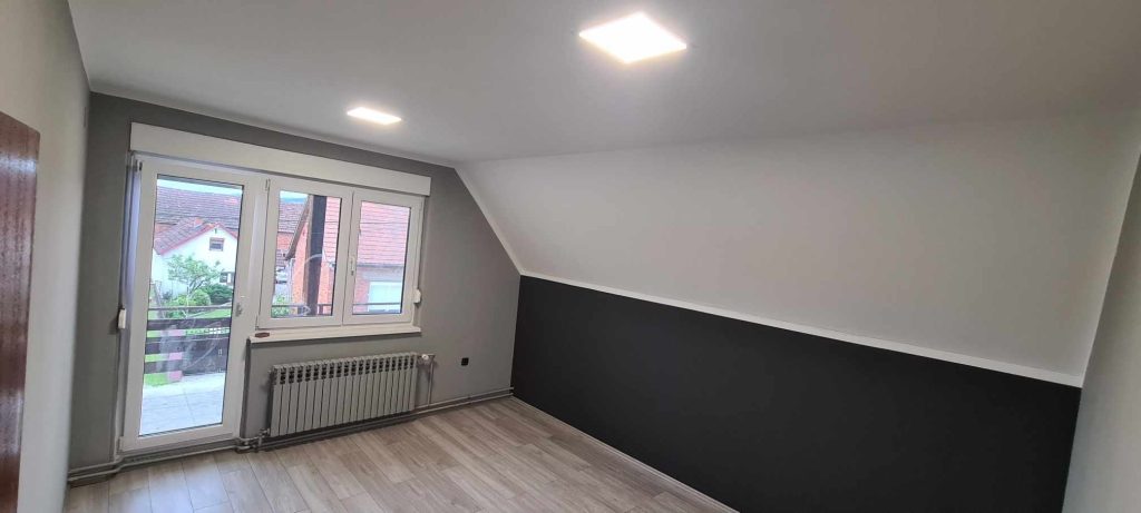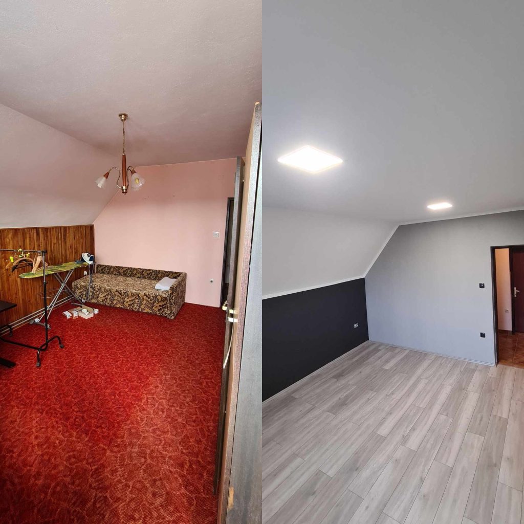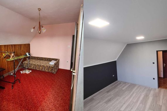Ovaj projekt preuređenja sobe donosi moderni izgled uz funkcionalne nadogradnje. Soba je sada izolirana staklenom vunom, a rigips je postavljen za poboljšanje estetike.
