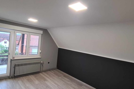Zidovi su prošli kroz proces gletanja te su obojeni u svijetlu bijelu boju, pružajući svjež i prostran dojam. Crni zid s efektom dodaje modernu notu prostoru, stvarajući suptilan kontrast.